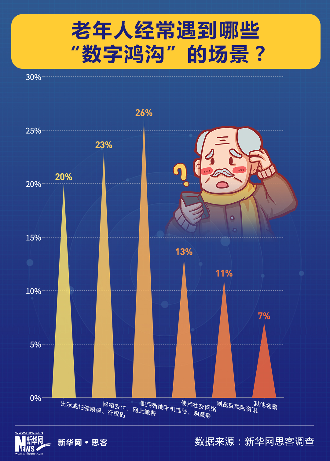 新华网思客针对老年人遇到的“数字鸿沟”场景进行调查,结果发现,老年人群体在“出示或扫健康码、行程码”“网络支付、网上缴费”“使用智能手机进行医院挂号、网约车、火车票购票等生活服务”“使用社交网络进行社交”“浏览互联网资讯”等方面都存在不同程度的不便。