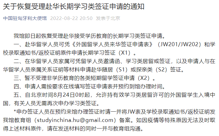 近期,多个驻外使馆发布通知显示,持有效APEC商务旅行卡赴华从事商务活动的外国人和持有效学习类居留许可的外国留学生,自北京时间8月24日0时起,可持上述证件入境,无需重新办理签证。部分驻外使馆也已开始恢复长期赴华留学签证的申请工作。