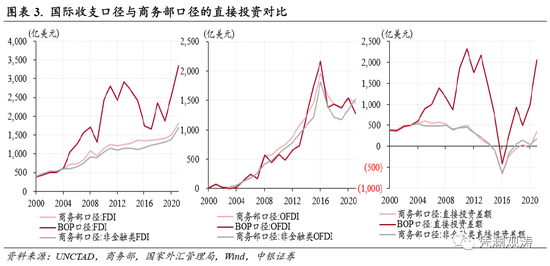 如果稍加留意的话,大家可以观察到,图表1中的国际收支口径货物贸易和直接投资差额数据,与我们通常看到的月度高频数据差距甚大。这是因为海关口径的外贸进出口数据和商务部口径的跨境直接投资数据(包括外商直接投资和对外直接投资),与国际收支口径(以下简称BOP口径)的相关数据都存在较大差异。
