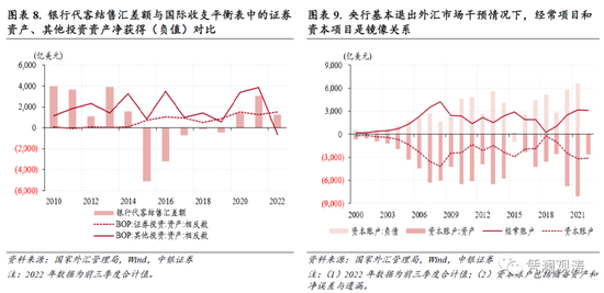在央行外汇市场干预常态化情况下,银行结售汇顺差会转化为外汇储备,中国外汇储备余额最高曾升至2014年6月份的近四万亿美元。而2018年以来,由于央行已经基本退出外汇市场干预,因此银行结售汇顺差并没有导致外汇储备大幅增加,而是转变为银行持有的外汇头寸,流量会被借记国际收支平衡表中银行部门对外资本输出增加,存量会被记为国际投资头寸表中银行部门对外金融资产增加,二者均反映为资本外流。2020年至2022年三季度(目前国际收支平衡表正式数据只公布到2022年三季度),证券投资、其他投资的资产净获得累计值分别为4292亿、6555亿美元(见图表8)。