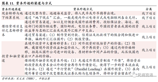 从经济上讲,净误差与遗漏和储备资产变动之外的线上项目【8】实际也可能隐含了不少违法违规的资本外逃,比如跨国公司通过内部定价,通过贸易渠道转移利润等就是典型的做法。上世纪末,有学者就用国内统计的进出口与海外统计的从中国的进出口数据对比,来估算贸易渠道隐藏的资本外逃。宋文兵(1999)总结了多种资本外逃的渠道与方式,既有线上渠道,又有线下渠道(见图表11)【9】。至于“两头在外”的对敲交易跨境转移资产,有可能在国际收支平衡表都没有被记录。
