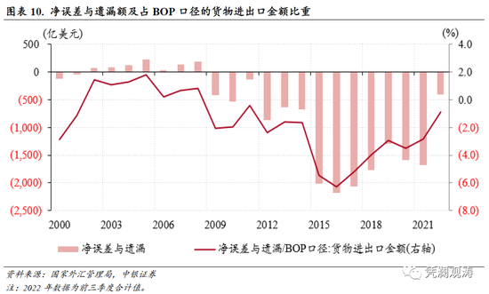 国际收支平衡表是按借贷记账法编制,遵循“有借必有贷、借贷必相等”的会计原则。理论上,国际收支口径的货物贸易顺差,最终都能找到对应项的逆差(包括交易引起的储备资产变动)予以冲抵。但是,这方面遇到的一个最大的障碍,就是净误差与遗漏项目。2009年以来,该项年度数值持续为负且规模较大,其绝对值占国际收支口径的货物进出口金额比重在2015年至2017年连续超过5%的国际标准,此后该比重有所降低,2022年前三季度甚至降至0.9%。但是,由于外贸进出口规模的日益扩大,2020~2022年前三季度净误差与遗漏负值累计为3666亿美元(见图表10)。市场通常将净误差与遗漏负值视为中国存在严重的资本外逃。