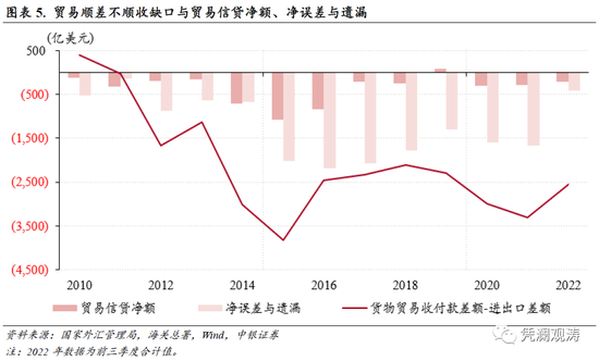 国际收支数据的统计原则是权责发生制,按照借贷记账法编制,货权变动和资金变动一一对应。银行涉外收付款数据统计原则为现金收付制,如果企业没有在银行发生收付款行为,这部分数据只能通过抽样调查或估算方式获得,反映为贸易信贷的资产负债变动。但受制于样本数的局限性和抽样的频率,贸易信贷统计的质量难以保证。从国际收支平衡表数据来看,贸易信贷在大部分时间为净流出,与货物贸易顺差不顺收负缺口的正相关性较强,2015年二者均达到最大,分别为-1082亿、-3822亿美元。不过,贸易信贷净额远小于贸易顺差不顺收负缺口,大量未被统计的交易会计入净误差与遗漏项(见图表5)。